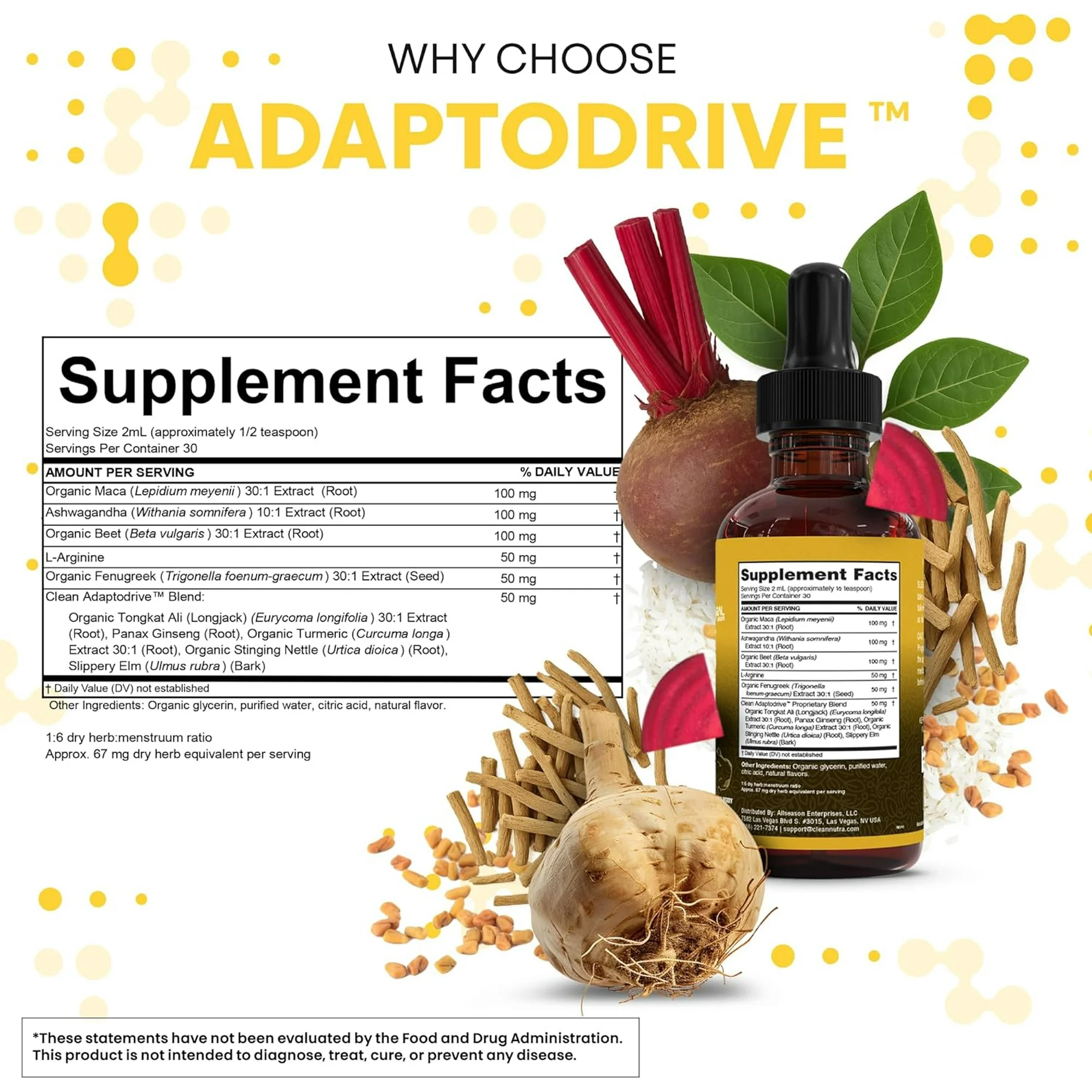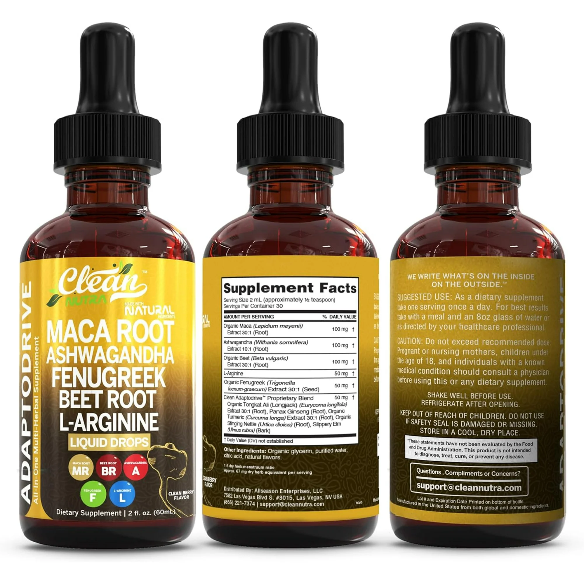 Clean Nutra Organic Maca Root Liquid Drops con Ashwagandha, Fenogreco, Raíz de Remolacha y L-Arginina Multivitamínico Líquido para mujer y Hombres - Adapto Drive