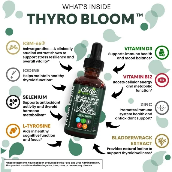 Clean Nutra Thyroid Support Liquid Drops, Selenium + Zinc + Iodine Complex, 120ml, con L-Tirosina y KSM66 Ashwagandha