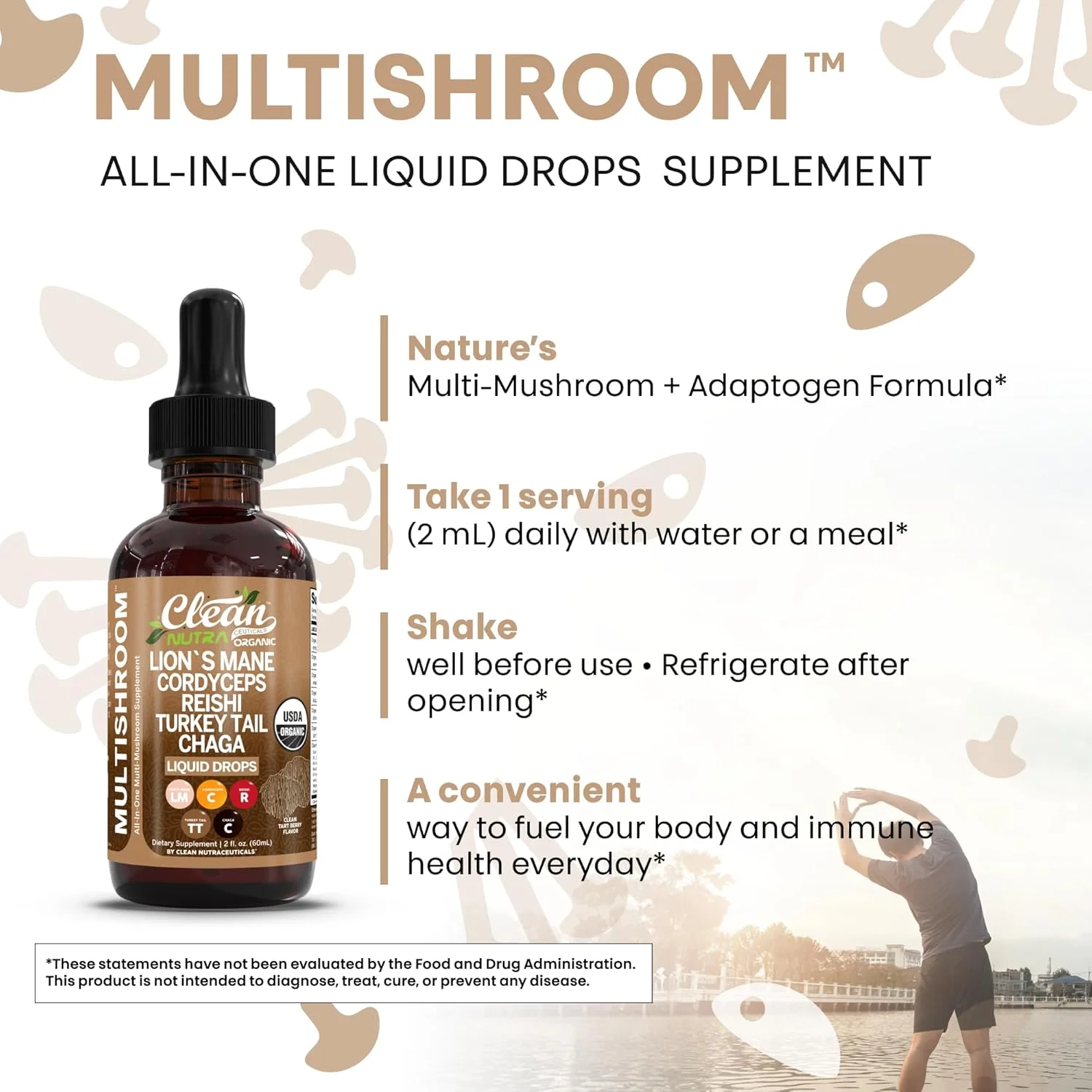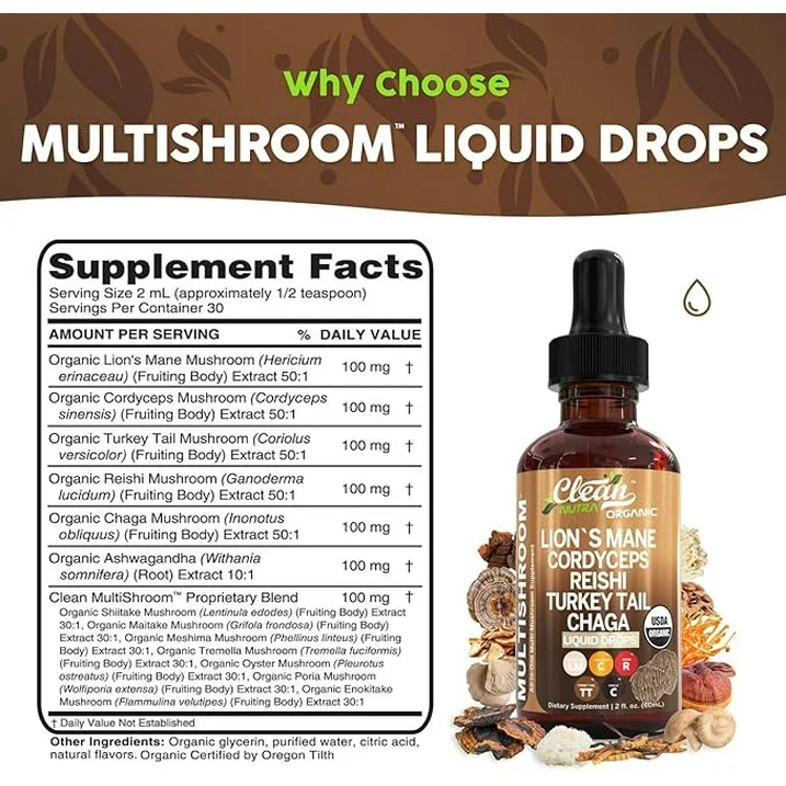 Suplemento de Hongos Melena de León Orgánico en Gotas Líquidas + Cola de Pavo Cordyceps Reishi Chaga Shitake Maitake Tremella Oyster Hongos Poria y Mezcla del Complejo Enokitake por Clean Nutra